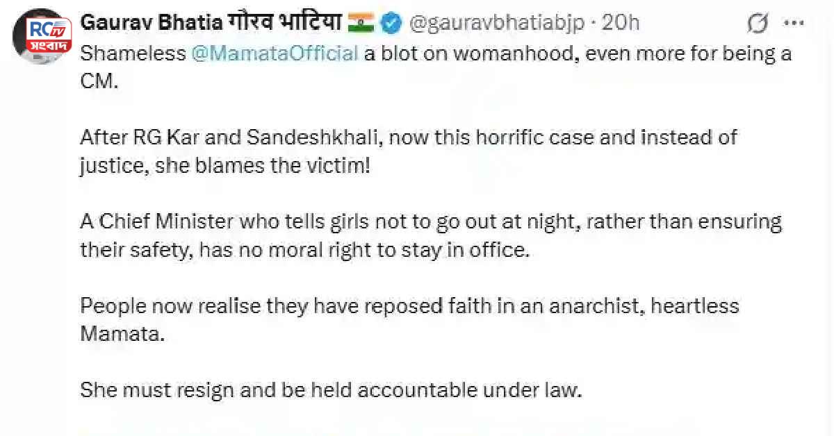 ভাটিয়া আরও অভিযোগ করেন, “আরজিকর, সন্দেশখালি, এখন দুর্গাপুর— একের পর এক ঘটনা প্রমাণ করে, বাংলায় মহিলারা নিরাপদ নন। দোষীরা ধরা পড়ছে না, বিচার হচ্ছে না।” তিনি আরও বলেন, “মানুষ আজ বুঝতে পারছে, তারা একজন নৈরাজ্যবাদী (anarchist)হৃদয়হীন (heartless) মানুষের হাতে দায়িত্ব তুলে দিয়েছিল। মমতা বন্দ্যোপাধ্যায়ের পদত্যাগ করা উচিত এবং আইনের আওতায় তাঁর জবাবদিহি হওয়া উচিত।”