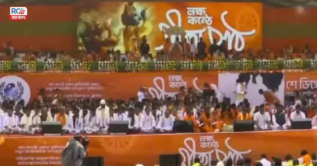 সনাতন সংস্কৃতি সংসদের (Sanatan Sanskriti Sangsad) উদ্যোগে আয়োজিত এই ‘৫ লক্ষ কণ্ঠে গীতাপাঠ’ কর্মসূচিতে যদিও রামদেব–সহ একাধিক বিশিষ্ট অতিথি অনুপস্থিত ছিলেন। ফলে মঞ্চে মূল কেন্দ্রবিন্দুতে রইলেন বঙ্গ বিজেপির (Bengal BJP) শীর্ষ নেতৃত্ব। বহুদিন পর একসঙ্গে দেখা গেল শমীক ভট্টাচার্য, সুকান্ত মজুমদার ও দিলীপ ঘোষকে (Dilip Ghosh)। অন্যদিকে, বিরোধী দলনেতা শুভেন্দু অধিকারী (Suvendu Adhikari) নিজের আসন ছেড়ে মাটিতে বসে গীতাপাঠ শুনতে দেখা যায়—যা বিশেষ নজর কাড়ে।