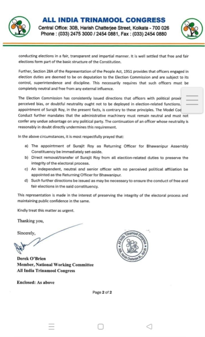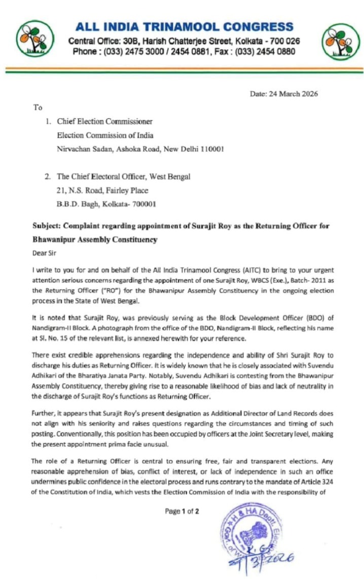 তৃণমূলের জাতীয় কার্যনির্বাহী কমিটির সদস্য ডেরেক ও’ব্রায়েন প্রেরিত ওই চিঠিতে অভিযোগ করা হয়েছে যে, ২০১১ ব্যাচের ডব্লিউবিসিএস (WBCS) অফিসার সুরজিৎ রায় রাজ্যের বিরোধী দলনেতা শুভেন্দু অধিকারীর (Suvendu Adhikari) অত্যন্ত ঘনিষ্ঠ। উল্লেখ্য, সুরজিৎ রায় এর আগে নন্দীগ্রাম-২ ব্লকের বিডিও (BDO) হিসেবে দায়িত্ব পালন করেছেন। যেহেতু শুভেন্দু অধিকারী এবার ভবানীপুর কেন্দ্র থেকে প্রতিদ্বন্দ্বিতা করছেন, তাই তাঁর পরিচিত অফিসার রিটার্নিং অফিসারের দায়িত্বে থাকলে নির্বাচনের নিরপেক্ষতা (Neutrality) ও স্বচ্ছতা বিঘ্নিত হতে পারে বলে আশঙ্কা প্রকাশ করেছে শাসকদল।